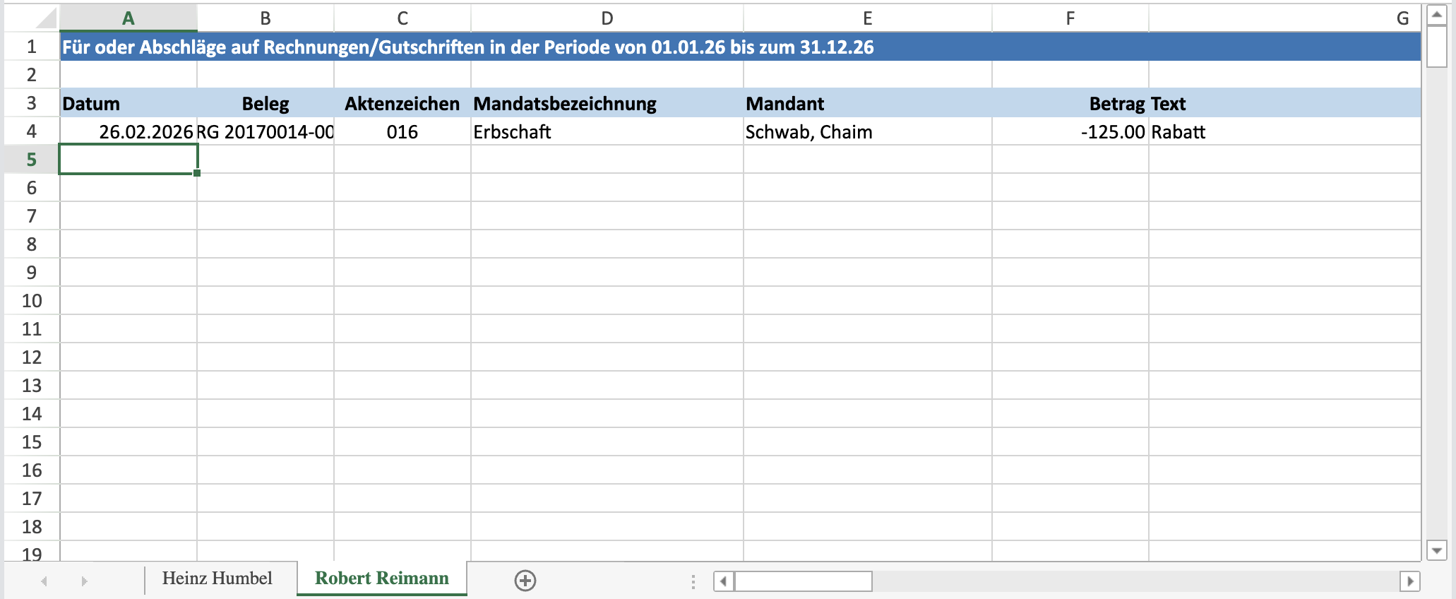 Dieser Report dient dazu, für eine frei wählbare Periode eine Übersicht über die in den Rechnungen vorgenommenen Abschläge zu erstellen. Zunächst werden die in der gewählten Periode vorgenommenen Rechnungsabschläge in der Datenbank gesucht. Diese werden anschliessend nach Mandatsführer gruppiert und pro Mandatsführer wird ein Arbeitsblatt erstellt, in welchem die gefundenen Abschläge mit den Informationen zu den entsprechenden Rechnungen und dem Mandat aufgeführt sind. So können allfällig vorgenommene Abschläge auf Rechnungen auch nachträglich nochmals überprüft werden.
