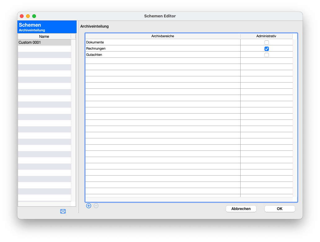 Je nach Auswahl gelangen Sie in den Schemeneditor der Custom Archiveinteilung oder der allgemeinen Archiveinteilung.
