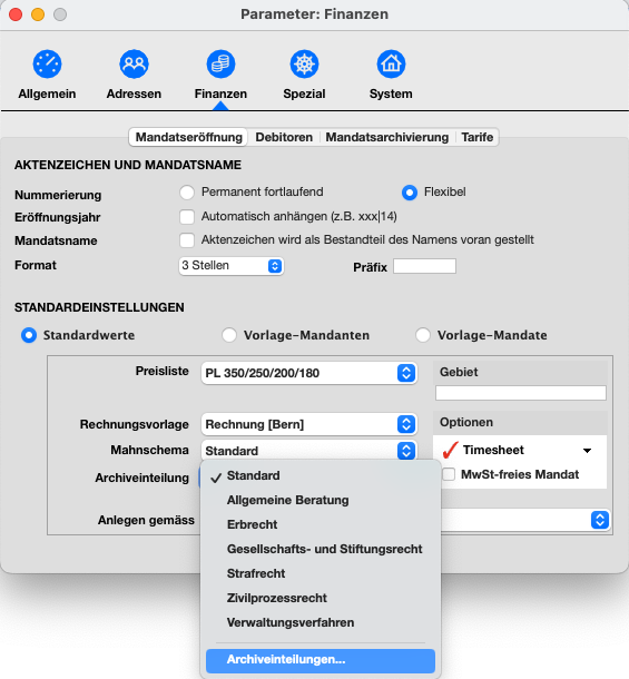 Sie gelangen zur allgemeinen Archiveinteilung via Einstellungen → Parameter → Finanzen → Mandatseröffnung → Regler Archiveinteilung.