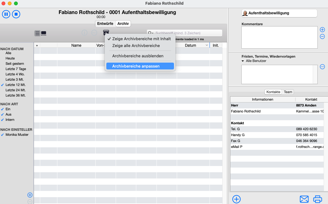 Via Tab Archiv in der Mandatsmappe (allgemeine und custom Archiveinteilung)