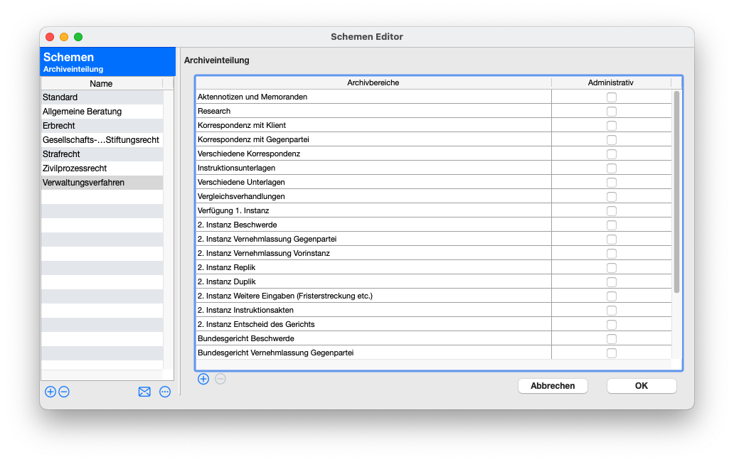 In der Regel werden mehrere Archiveinteilungen für verschiedene Rechtsgebiete oder verschiedene Präferenzen der Partner:innen erstellt. Diese sind, sofern sie in einem Mandat ausgewählt sind übergreifend. Dies bedeutet, dass eine Anpassung der Archivbereiche einer spezifischen Archiveinteilung im Schemeneditor sich auf alle Mandate, in welchen die Archiveinteilung angewendet wurde, auswirkt.
