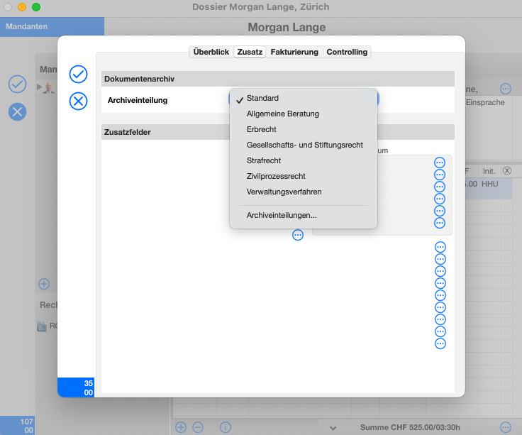 Öffnen Sie die Mandatsebene (Doppelklick auf das Mandat im Dossier) und navigieren Sie in den Reiter Zusatz.