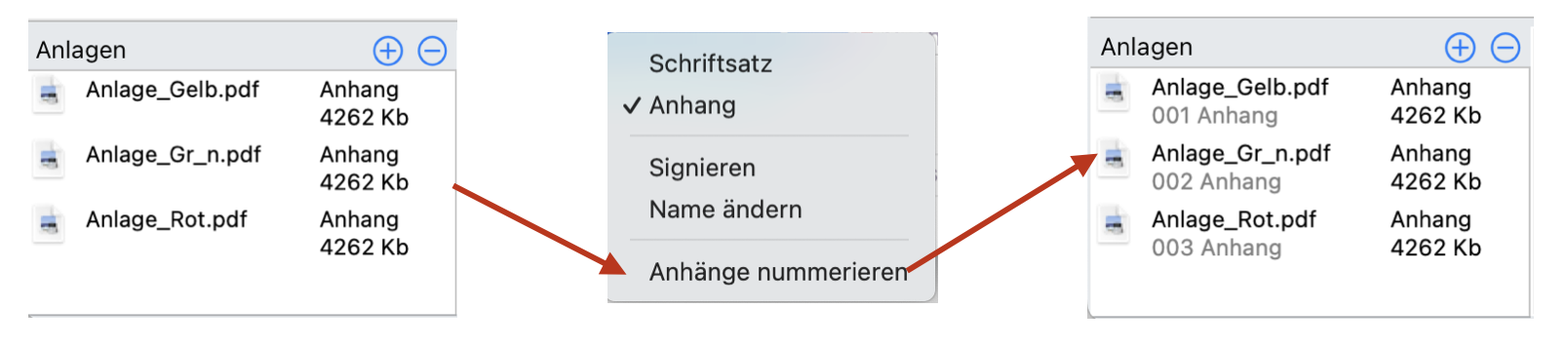 Im Versandfenster für beA Nachrichten ist es nun möglich, die Anlagen mit einer Nummerierung zu versehen. Ordnen Sie die Anlagen zunächst per Drag & Drop wie gewünscht an. Führen Sie dann einen Rechtsklick auf eine der Anlagen aus und wählen Sie im Menu Anlagen nummerieren.