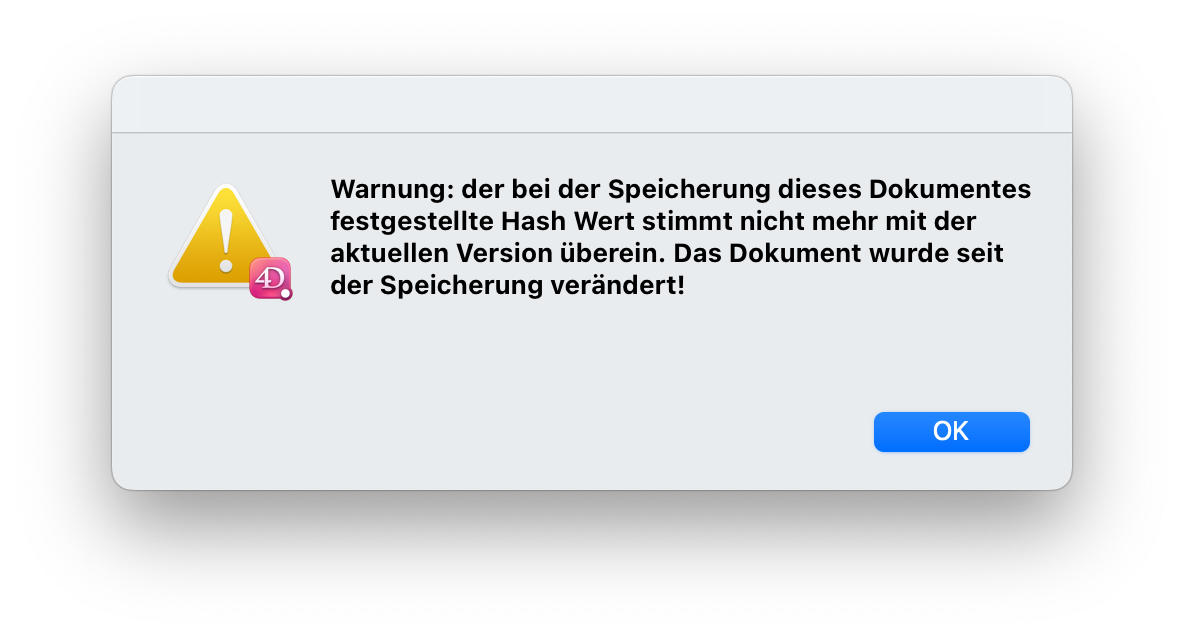 - Errechnung einer digitalen Prüfsumme. Beim Einstellen eines Dokuments in das Archiv, berechnet timeSensor LEGAL 365 eine Prüfsumme. Bei jedem Öffnen des Dokuments prüft timeSensor LEGAL 365, ob die Prüfsumme des Dokuments noch der ursprünglichen Prüfsumme entspricht. Falls dies nicht der Fall ist, wird eine Warnung angezeigt.
