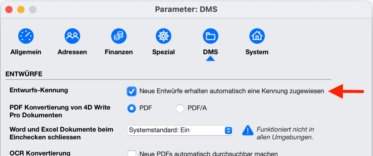 Zunächst muss diese Option eingeschaltet werden. Begeben Sie sich hierzu in den Einstellungsbereich und öffnen Sie das Parameter Fenster. Aktivieren Sie im Bereich DMS die entsprechende Checkbox. Hierzu sind Administrationsrechte erforderlich.