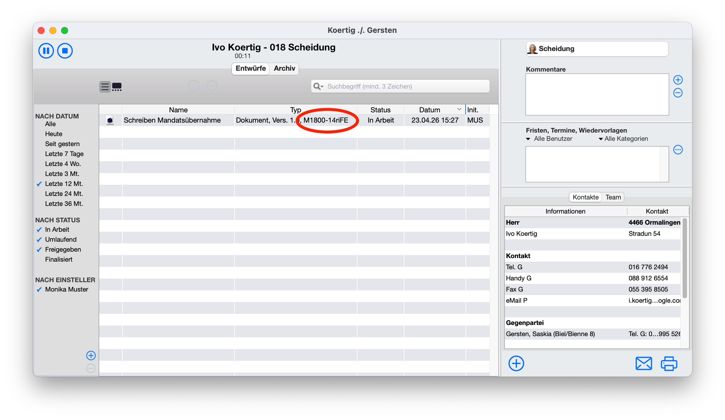 Die Kennung kann nicht nur in das Dokument eingefügt werden, sondern wird auch in der Anzeige der Entwürfe sichtbar. Ausserdem kann nach der Kennung leicht gesucht werden.