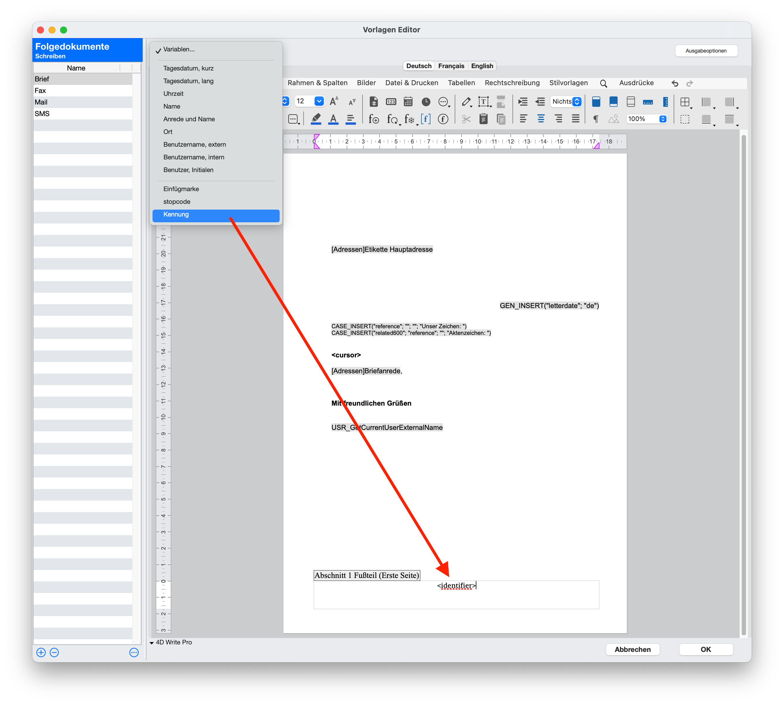 Wenn Sie in 4D Write Vorlagen eine Kennung einfügen möchten, dann wählen Sie aus dem Menu Variabeln... den Eintrag Kennung. Die entsprechende Variable wird nun in den Text eingefügt. Bei Verwendung der Vorlage, wird die Variable durch die Kennung des Entwurfs ersetzt.