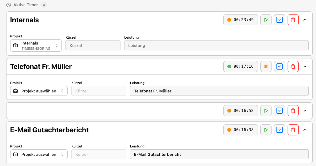 Ein Timer beginnt zu laufen. Die Leistung, für welche der Timer läuft, kann jeweils via der Schaltflächen rechter Hand pausiert, finalisiert oder gelöscht werden. Wir der Eintrag finalisiert, also final erfasst, wird dieser nach unten in die Liste der bereits erfassten Timesheet Leistungen verschoben.