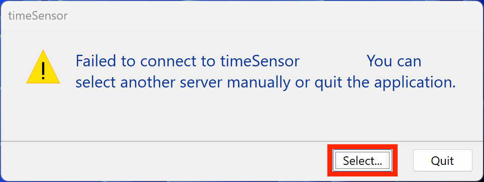 - Start the timeSensor 365 Client using the shortcut on your Desktop created by the installer. After a few seconds, you will be presented with an error message "Failed to connect to timeSensor...". Click on "Select...".