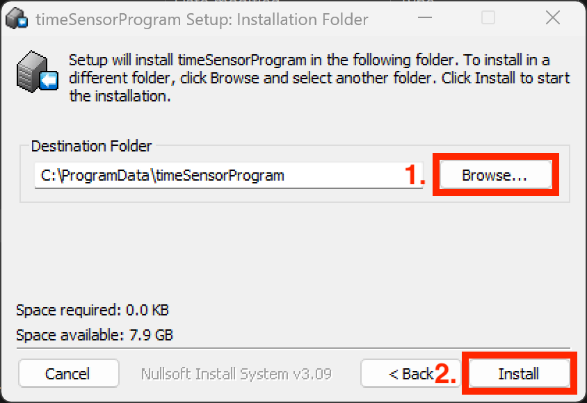 Select the path where timeSensor Client should be installed. The default path is C:\ProgramData\timeSensorProgram. However, in order to ensure that the automatic update process does not fail due to insufficient rights, we recommend changing it and installing the software in C:\Users\your_username\timeSensorProgram. Click "Browse" to change the path (a new window will open for you to select the destination folder), then click "Install".