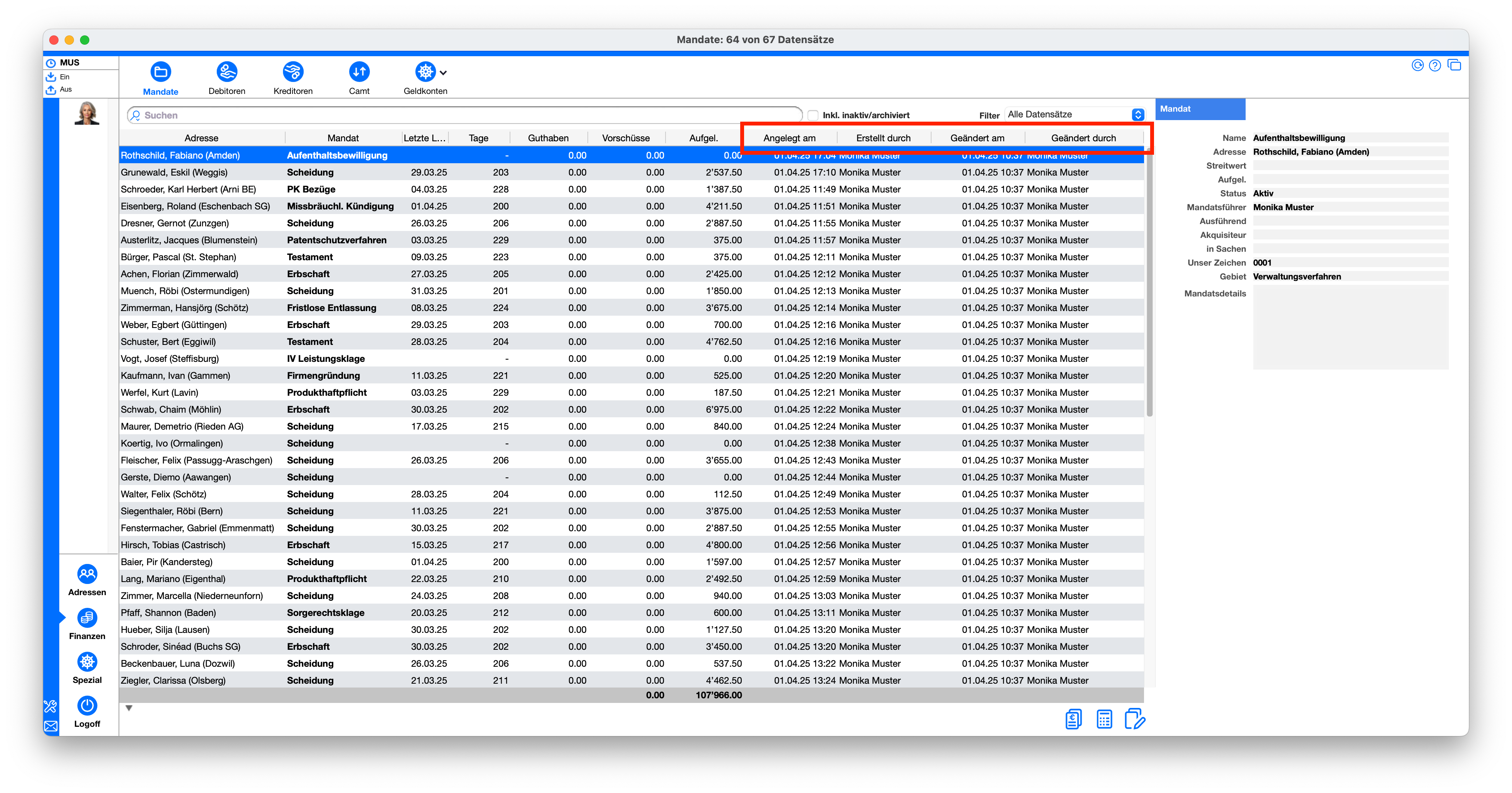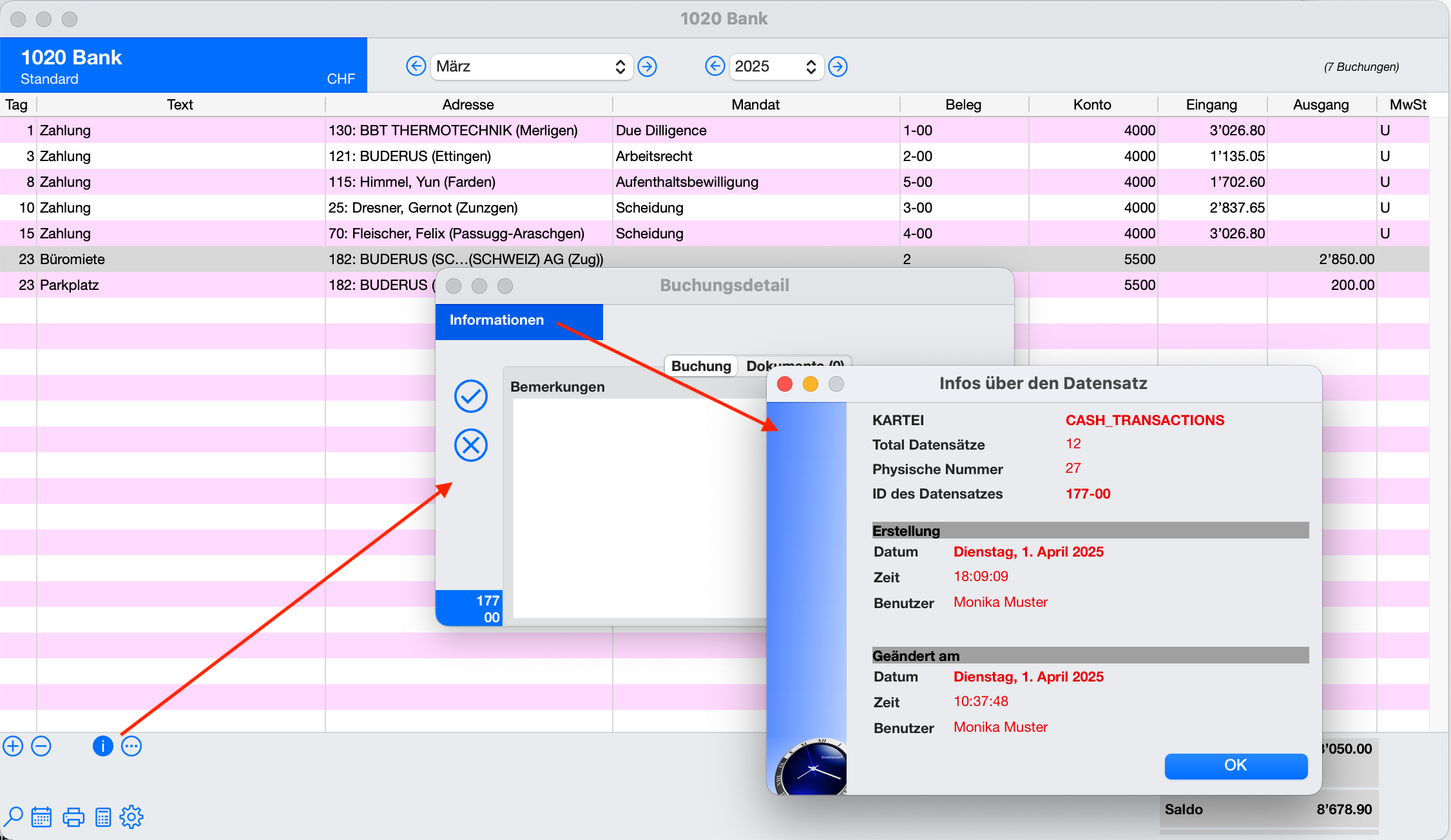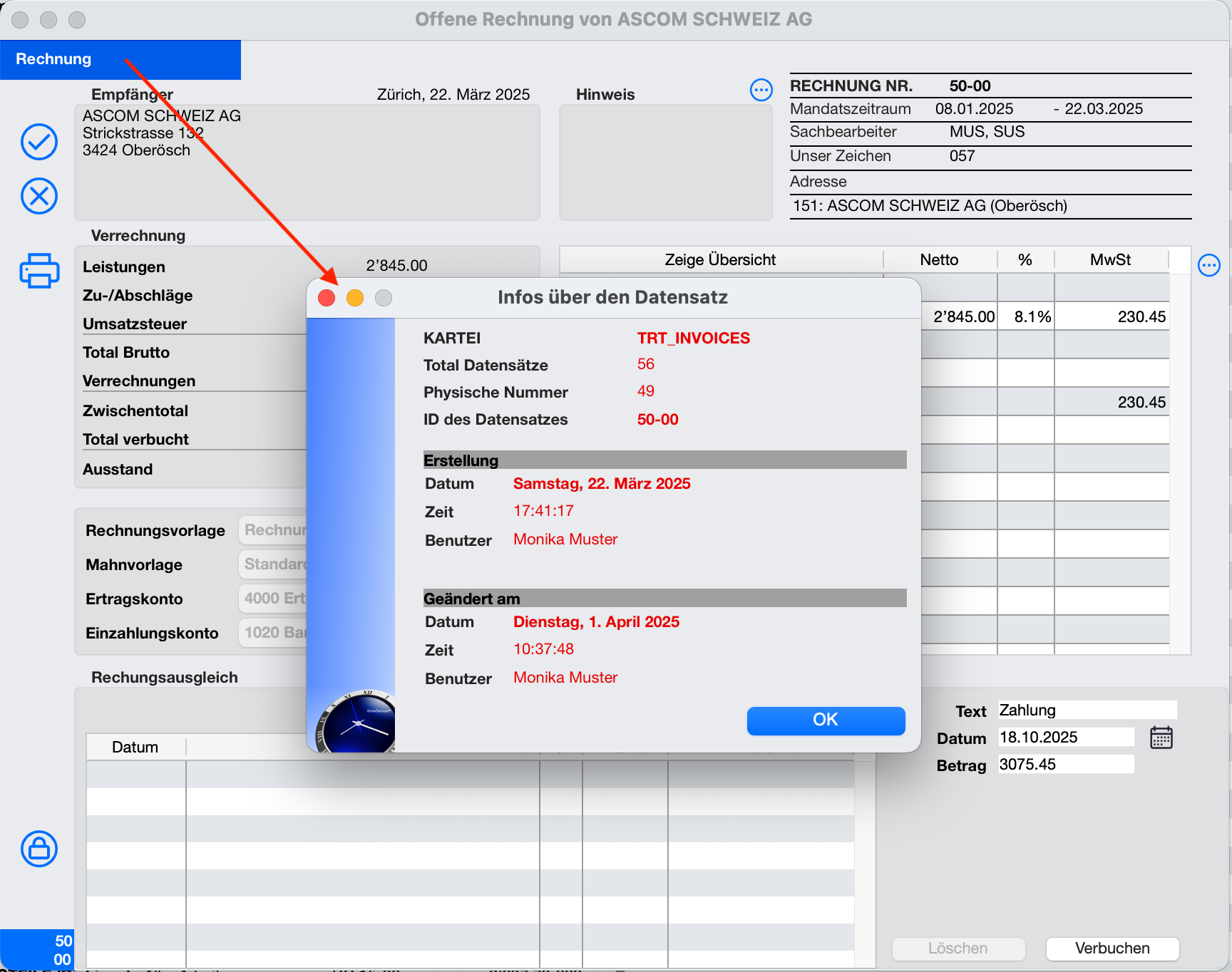 Selon la table, les champs additionnels peuvent parfois être consultés via l'interface utilisateur de timeSensor LEGAL 365. Il suffit pour cela de cliquer sur le label en haut à gauche de la fenêtre dans un enregistrement. Une fenêtre s'ouvre avec A propos de l'enregistrementLes captures d'écran suivantes illustrent cela à l'aide de deux exemples, une fois pour un enregistrement de facture et une fois pour une transaction en comptabilité.