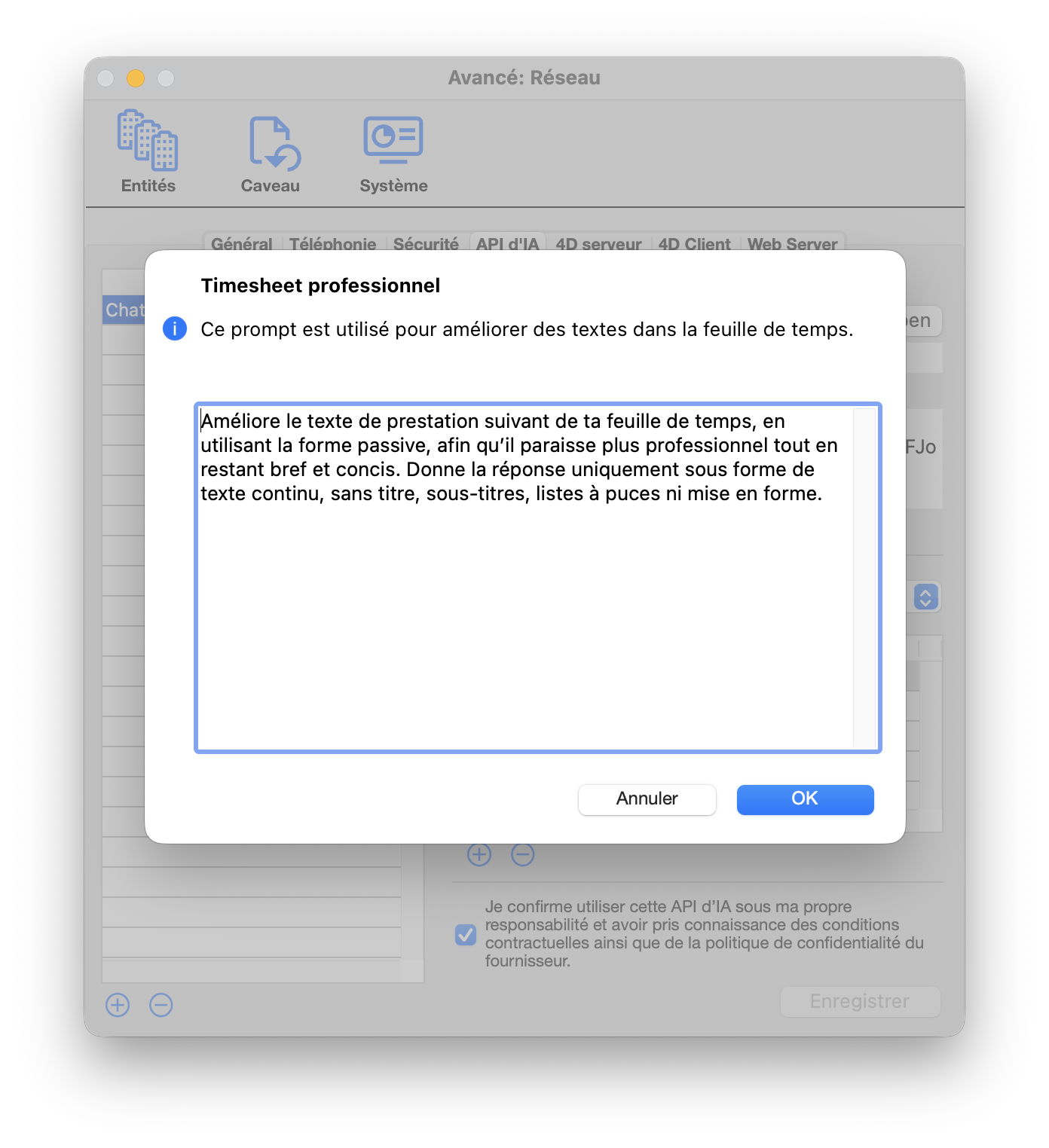 L'utilisation de cette fonctionnalité se fait à vos propres risques. Vous êtes tenu de vous assurer avant la transmission que le partage des données concernées avec le service d'IA est légalement autorisé et ne viole aucune obligation de confidentialité contractuelle ou légale.