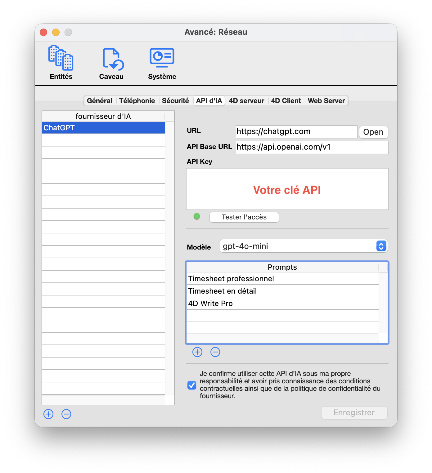 Cliquez maintenant sur le bouton Tester l'accès. Si la clé API est valide, le point devient vert et vous pouvez désormais sélectionner le modèle linguistique désiré du fournisseur dans le menu. Dans notre exemple, nous avons sélectionné le modèle gpt-4o-mini.