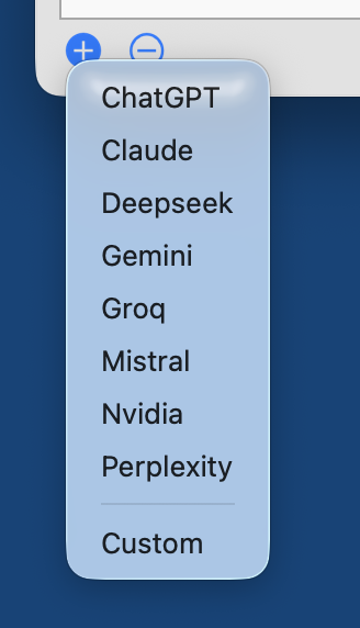 Comme la plupart des modèles linguistiques proposent une API compatible avec ChatGPT (OpenAI a établi des normes), vous n'êtes pas limité à un modèle linguistique spécifique lors de l'intégration dans timeSensor LEGAL 365. En fait, vous pouvez déjà choisir parmi une multitude de modèles compatibles. Dans la boîte de configuration de timeSensor LEGAL 365 (zone Paramètres -> Administrateur -> Avancés -> Système -> API d'IA), vous pouvez ajouter plusieurs modèles linguistiques à utiliser dans le logiciel. Cliquez sur le bouton (+) en dessous de la boîte des fournisseurs d'IA pour ajouter l'un des fournisseurs suivants :