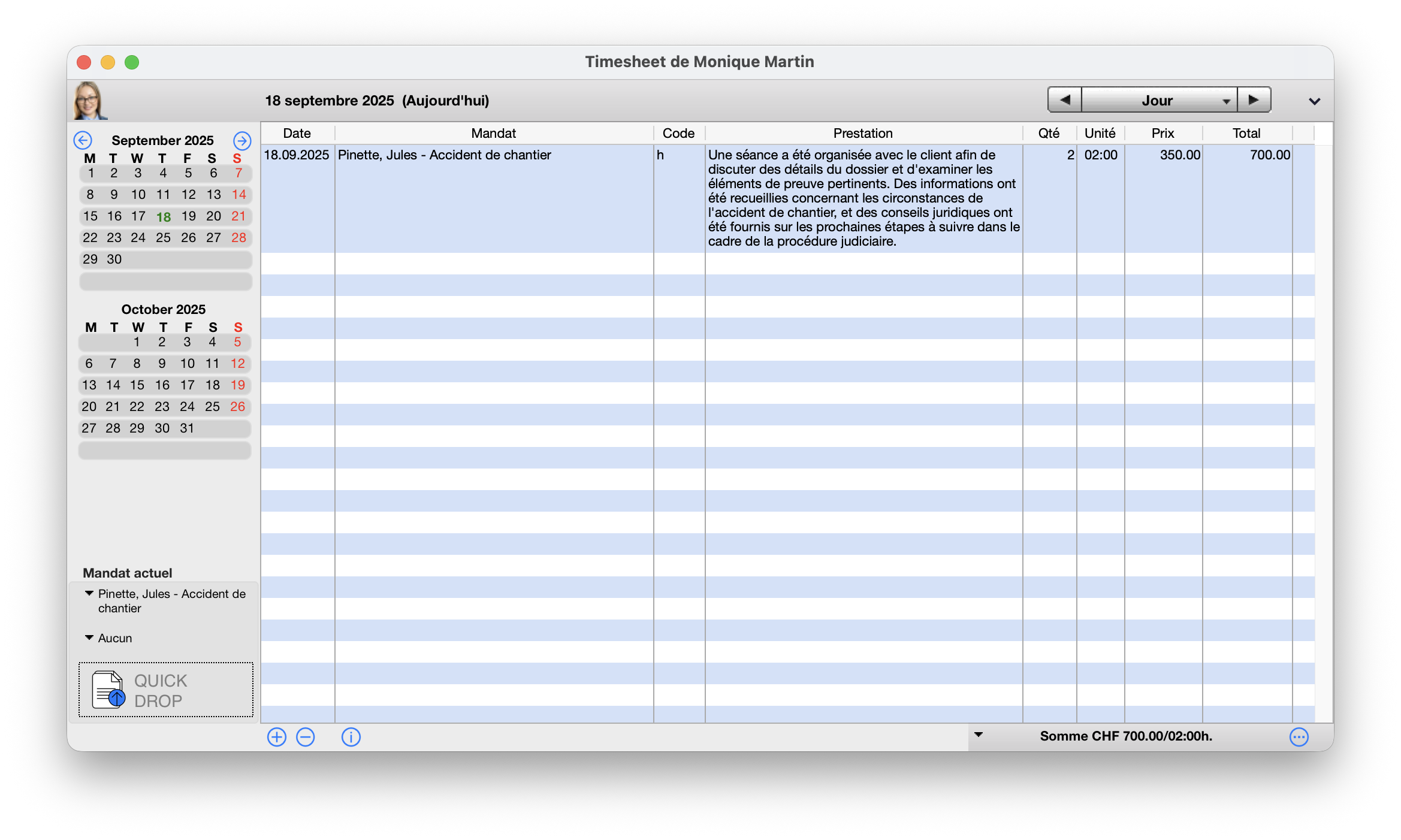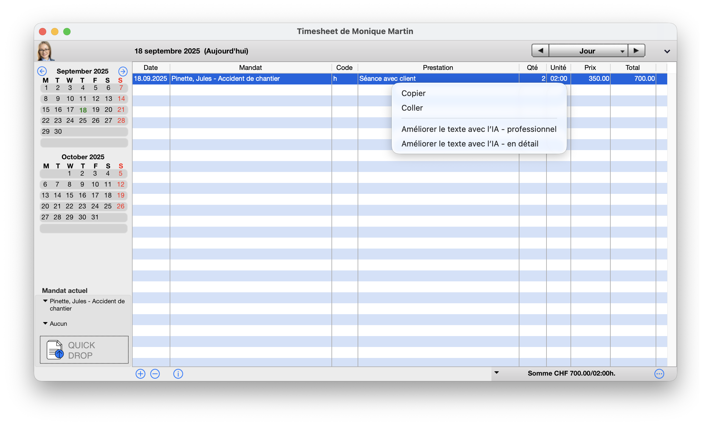 Vous avez enregistré la prestation Séance avec client pour l'accident de chantier de M. Pinette. Nous pouvons faire mieux ! Faites un clic droit sur la prestation pour afficher le menu contextuel. Vous disposez de deux options pour améliorer le texte avec l'IA :